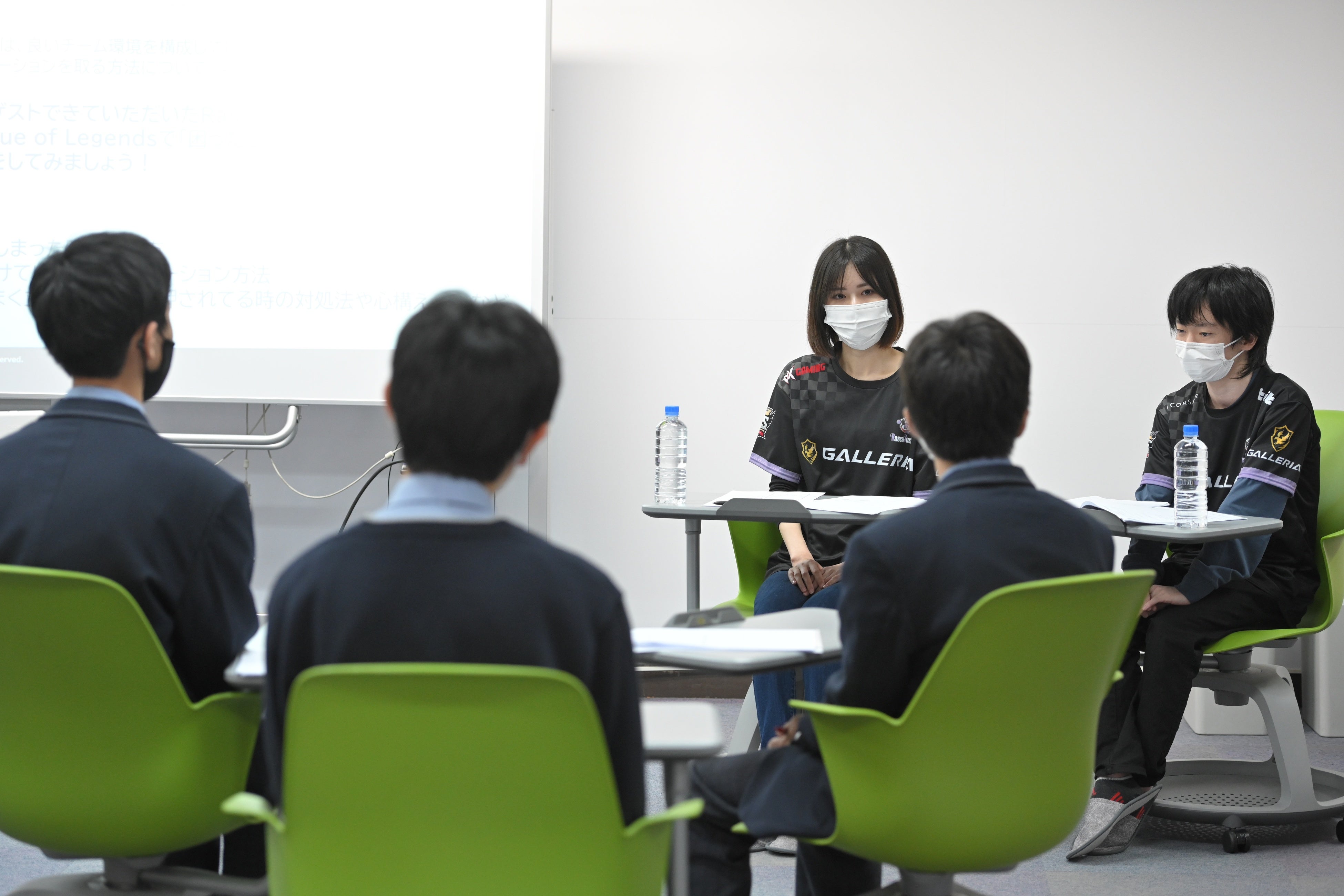 数分後、行われたグループ発表では、eスポーツ部の生徒から「いいチーム環境とは、互いに信頼し合えるようにすることや、失敗しても悪く言わないこと、プラスの方向へ持っていけるようにすること、緊張場面では、判断があっているのか確認しつつ、自分の意見を言うことが大事だと思います。」という、コメントが。それに対し、Rascal JesterのSirotama選手は、「対戦中にアドリブで色々と決めると良く無いので、どう戦うのか、どういうゲーム展開にするのか、チームで何か形を持っておくと緊張状態でもコミュニケーションが取りやすくなる。また、負けている時は自分のミスが分からないものなので、時間を空けて気持ちをリセットしたり、自分のプレーを見つめ直すことも良いチーム環境を構成する要因になる。 」と、第一線で活躍するプロならではの向き合い方を届けました。