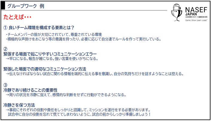 講師を務める岡田氏は、「そうですね。事前の準備や、味方に適切に気持ちを伝えることはとても大切です。またメンタルによって左右されることが多いゲームでもあるので、お互いにポジティブな言葉がけが重要になってくると思います。さらに、コーチや味方の意見を受け入れることも必要なこと。」と述べ、活発な意見交換が繰り広げられました。この日は50分という短縮したレッスン展開でしたが、通常の2時間で行うレッスンでは他にも、“プレイヤーが嬉しいコミュニケーションの方法や言葉”や“良いコミュニケーションを取り続けるとチームがどの様な力を発揮できるか”についてもワークショップを行いながら、チームワークを高める方法をレクチャーしていきます。
