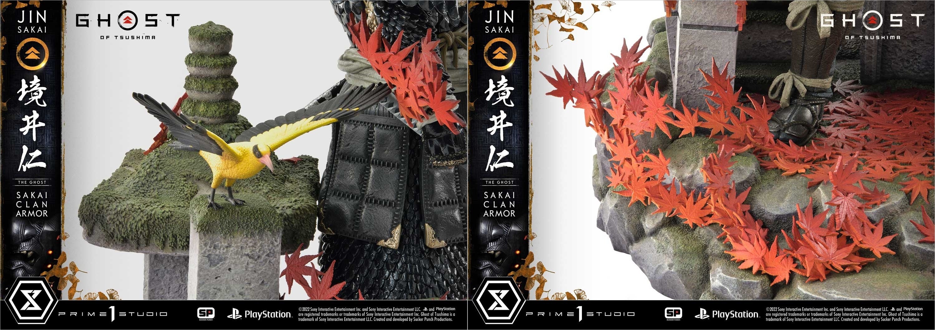 そしてゲーム中における和の世界観を凝縮したかのようなベース部の造形にも注目。前作で造形されたイチョウの葉に続き、本作は赤く色づき舞い散る無数の“モミジの葉”が作品に彩りを添え、それはまるで絵画のような刹那的美しさを漂わせます。苔むした墓石に石灯籠、そしてその上には、ゲーム中の重要キャラクターである“黄金色の導き鳥”の姿が。ファンならばニヤリとするような演出が随所に散りばめられています。