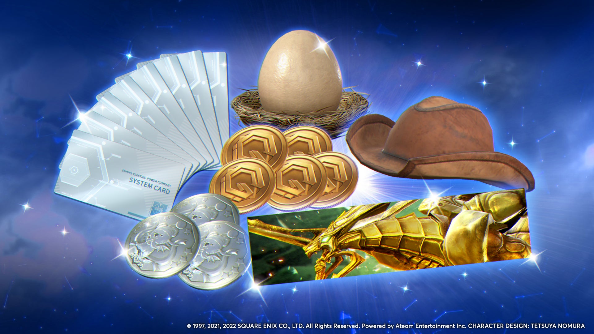 ログインするだけで「プレミアム神羅パックチケット(CC FF7)」12枚や、頭部アクセサリー「ガイドのティファハット(CC FF7)」、バナー「バハムート烈(CC FF7)」、チョコボの卵などが獲得できます。