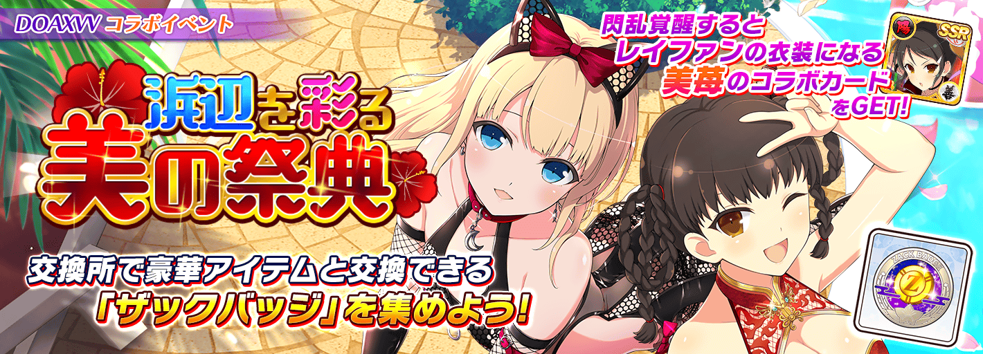 このイベントでは「DEAD OR ALIVE Xtreme Venus Vacation」の水着の「マリー・ローズ」「ほのか」「たまき」、さらに「レイファン」の水着を着た美苺などが登場する、DOAXVVとコラボした特別なシナリオを見ることができます♪