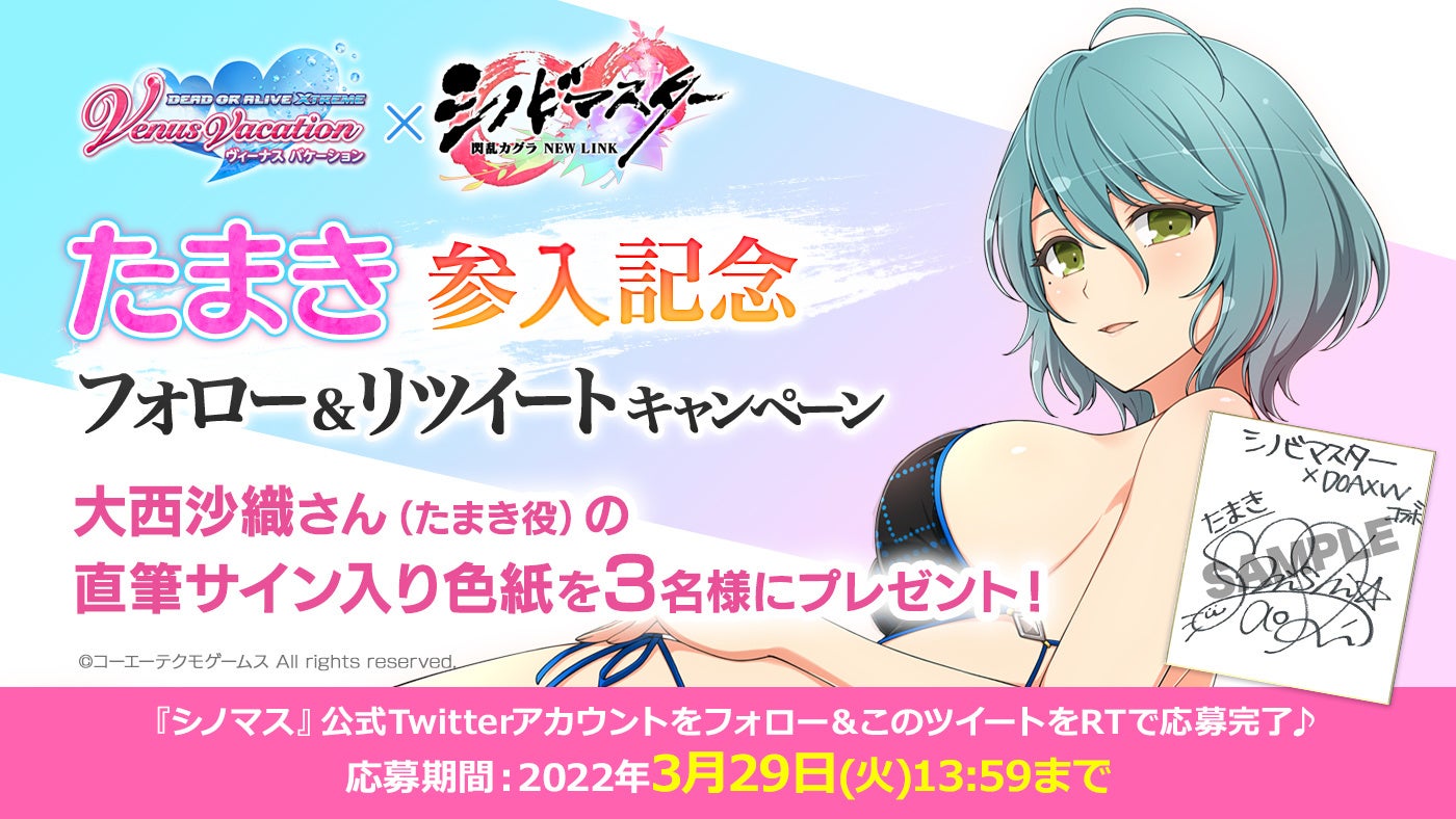 「たまき」の『シノマス』参入を記念し、大西沙織さん(たまき役)の直筆サイン入り色紙を、3名様にプレゼント!