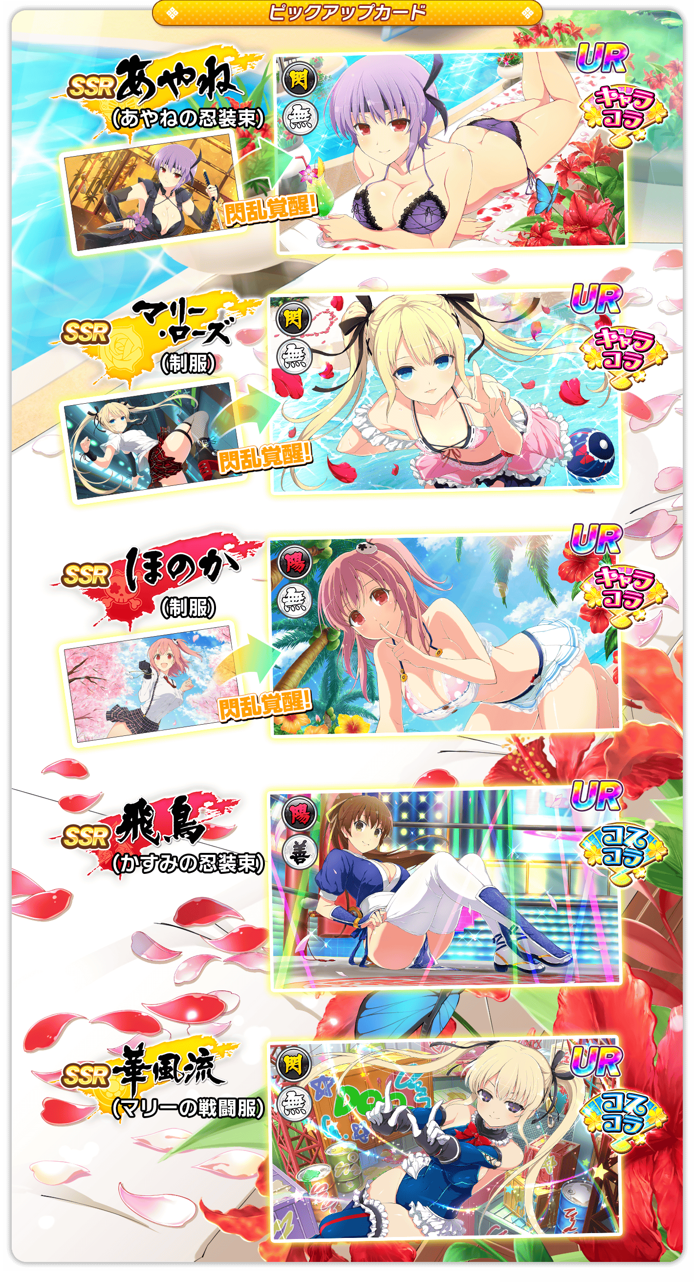 今回のコラボガチャの新カードは、閃乱覚醒前後で異なる「DEAD OR ALIVE Xtreme Venus Vacation」の水着衣装で登場します!