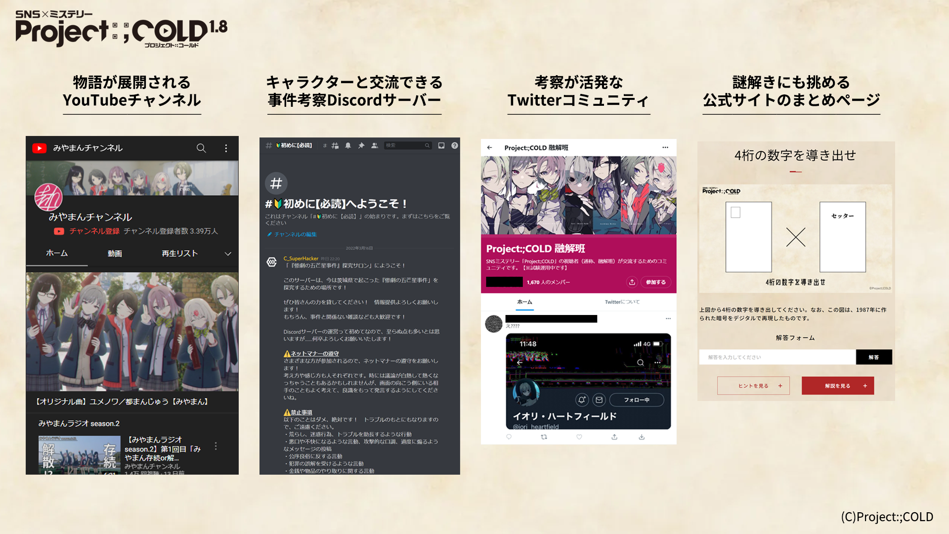 Cは事件を調査するためにDiscordサーバーを運営しており、実際に参加することができます。そこは“物語の内側”の世界です。ぜひ登場人物の一人として参加し、Cや他のプレイヤーとやり取りをしながら、事件の調査を進めてみてください。