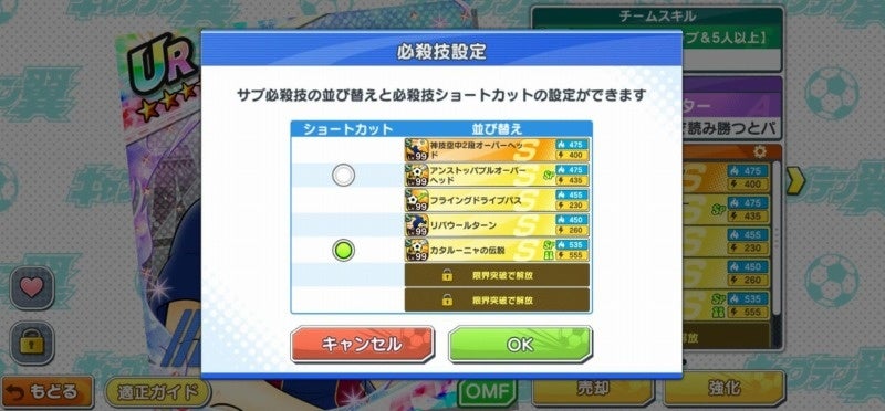 「必殺技設定」で、あらかじめ必殺技のショートカット設定を行っておくと、試合の画面上に、必殺技のシュートボタンが表示されるようになります。