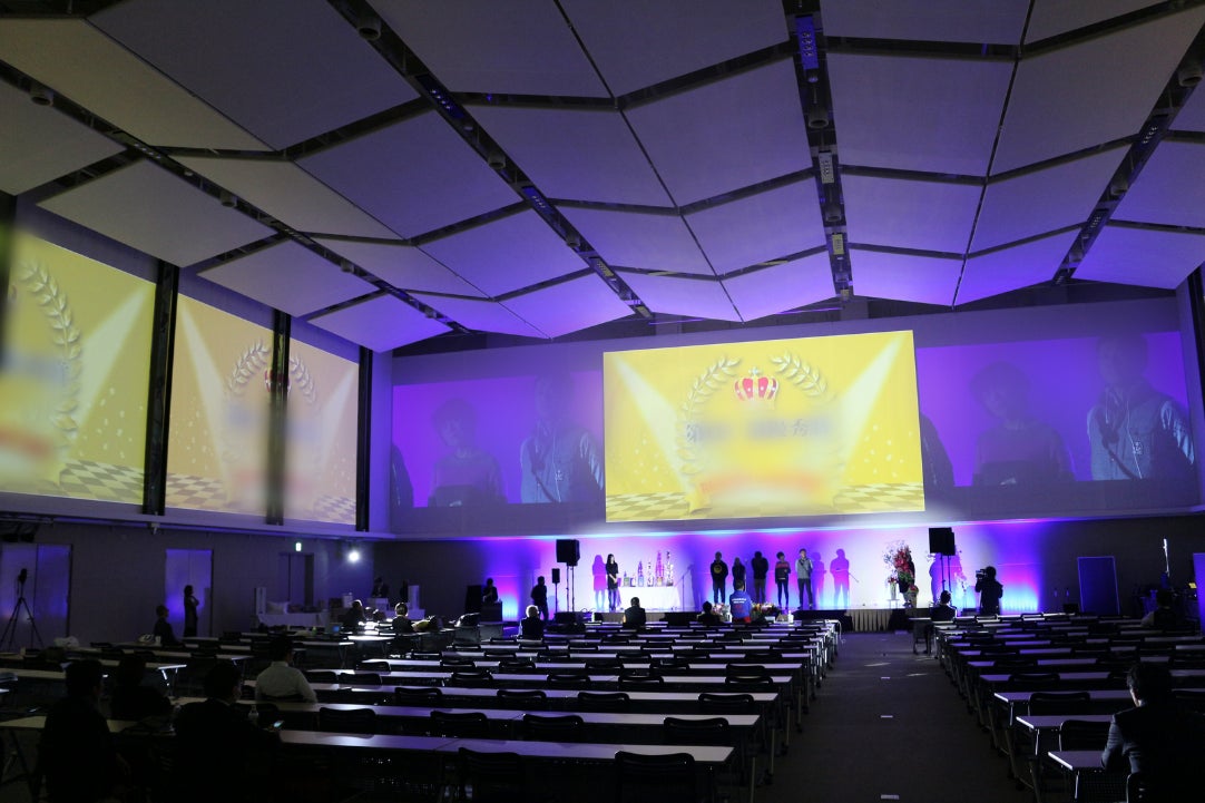 大会会場であるコスモホールは正面中央に国内最大級500インチスクリーンが、左右に300インチスクリーンが常設されております。