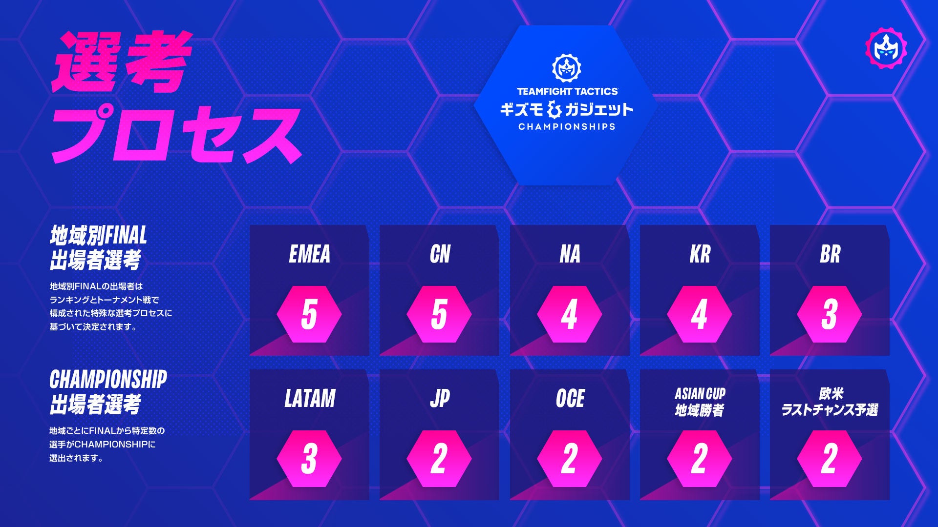 世界大会である「TFT: Gizmos & Gadgets Championship」の日本からの出場枠は2名となります(以前より1枠増加)。日本で実施する予選大会の優勝者、及び準優勝者が出場権利を獲得します。地域予選と世界大会は、両方オンラインでの開催となります。
