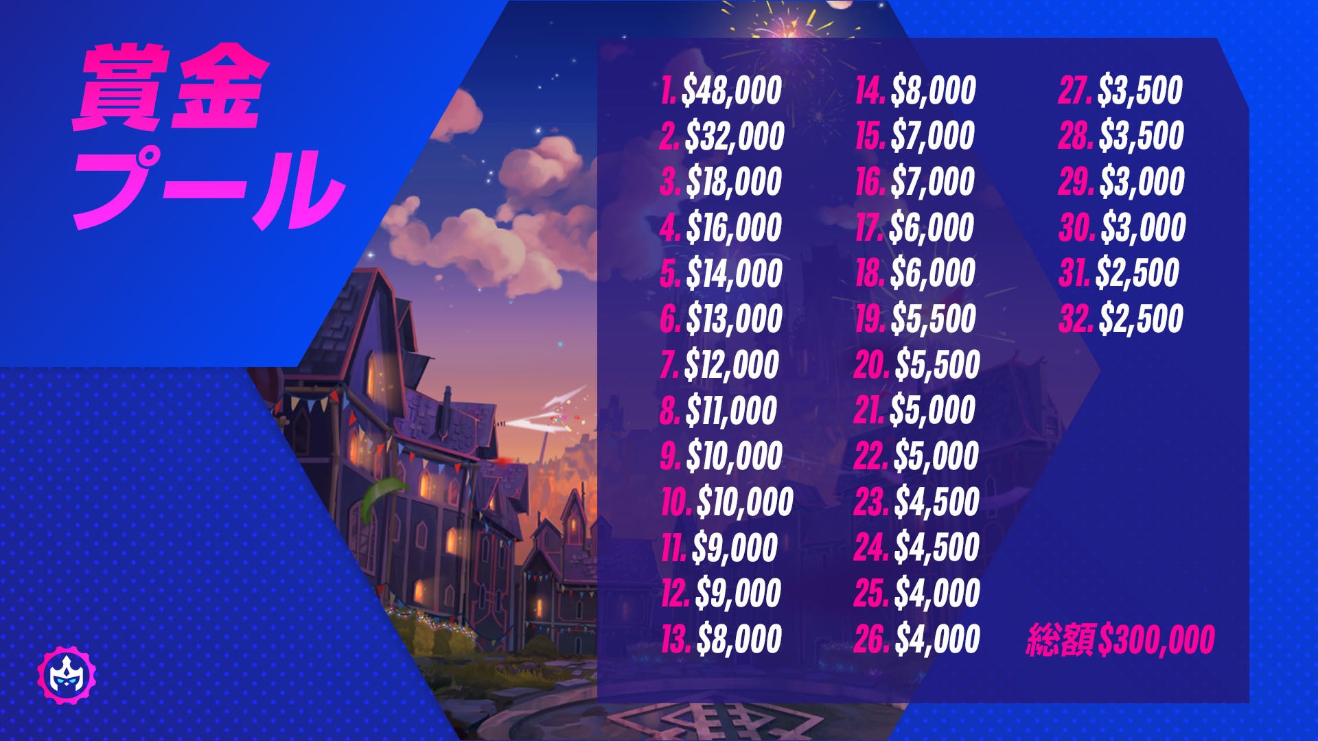 今大会の賞金総額は過去最高となる$300,000です!内訳は以下をご確認ください。