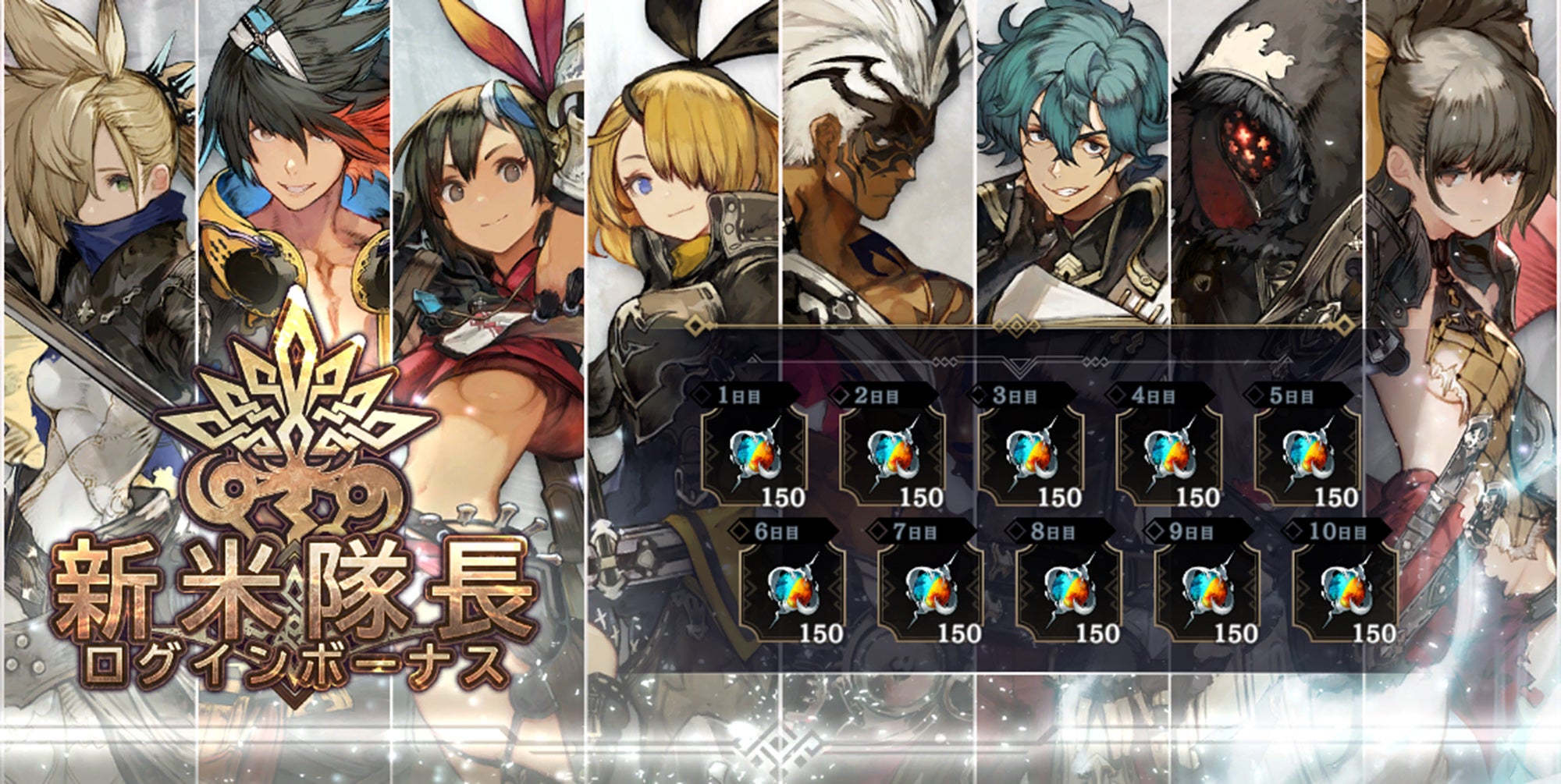 新米隊長を応援!ゲームにログインするだけで、毎日「ジェム」150個を最大10日間プレゼントします。