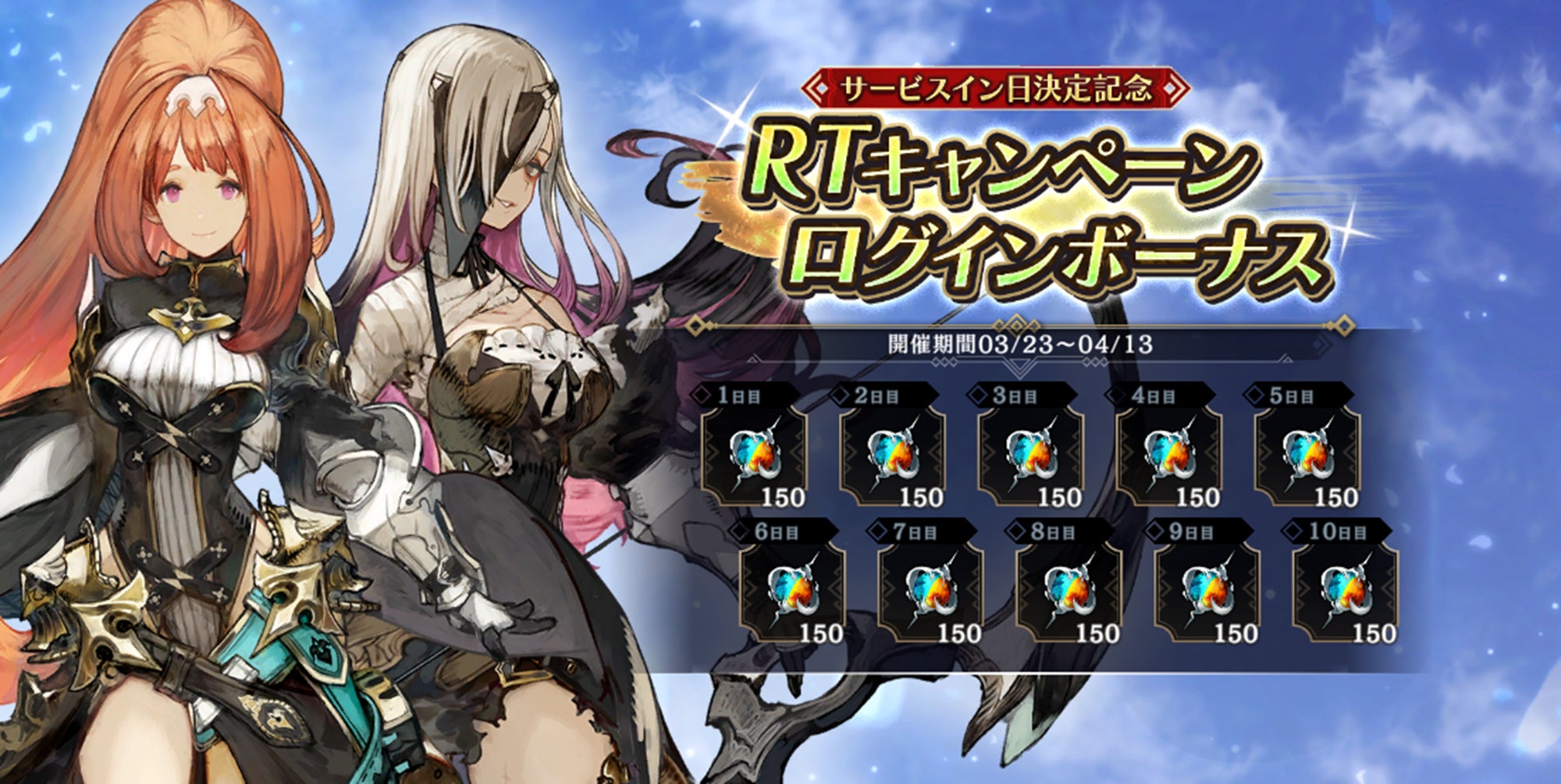 サービスイン日決定記念で開催されたRTキャンペーンの報酬として、期間中にゲームログインすると、毎日「ジェム」150個が最大10日間手に入ります。