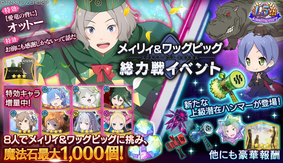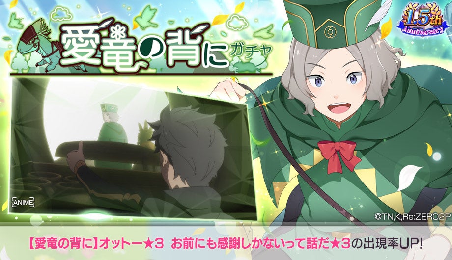 株式会社セガは、配信中の人気テレビアニメ「Re:ゼロから始める異世界生活」公式スマートフォン向けゲーム『Re:ゼロから始める異世界生活 Lost in Memories(以下、『リゼロス』)』にて、本日より期間中最大150回無料で引くことが可能な、「メィリィ&ワッグピッグ総力戦イベント」の特効を持ったキャラクター「【愛竜の背に】オットー★3」が新登場する「【愛竜の背に】ガチャ」を開催します。