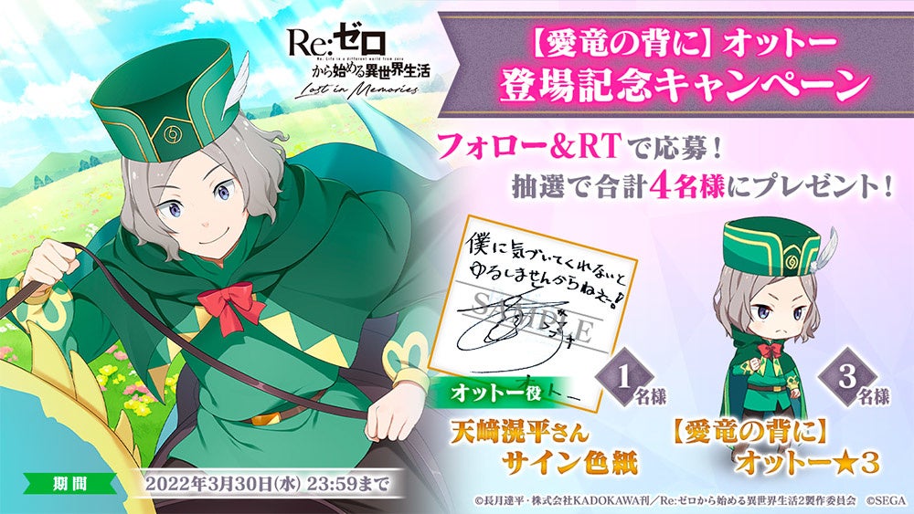 内容:『リゼロス』公式Twitter (https://twitter.com/re_zero_rezelos)をフォロー&キャンペーンツイートをRTすると、抽選で「オットー役・天﨑滉平さんサイン色紙」を1名様に、「【愛竜の背に】オットー★3」を3名様にプレゼントするキャンペーンを開催します。