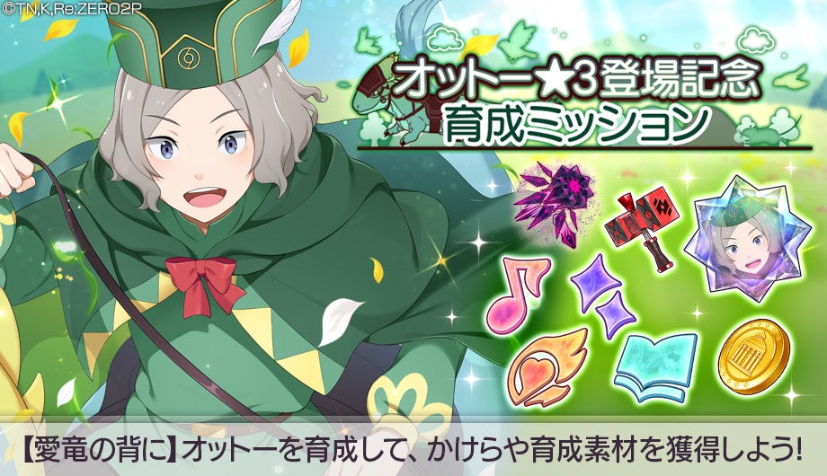 内容:「【愛竜の背に】オットー★3」を育成してミッションを達成すると、「極級潜在ハンマー」、「上限突破の秘薬」、「【愛竜の背に】オットーのかけら」などの育成素材が手に入る「オットー★3登場記念育成ミッション」を開催します。