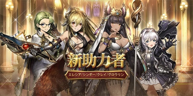 左から シンダー(☆5カイナの助力者、CV:松田颯水さん)、クレイ(☆5アヌビスの助力者、CV:行成とあさん)、 グロウリン(☆5グロリアの助力者、CV:春野杏さん)、エレシア(☆3アリネスの助力者、CV:皆森水希さん)