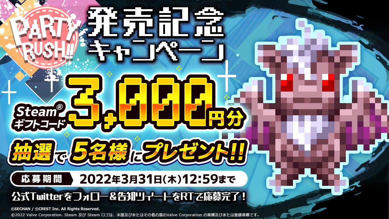 株式会社CREST(以下「CREST」)は、SECHAN制作の新作RPGゲーム『パーティラッシュ!!』のSteamⓇ製品版を本日2022年3月24日(木)に発売したことをお知らせいたします。