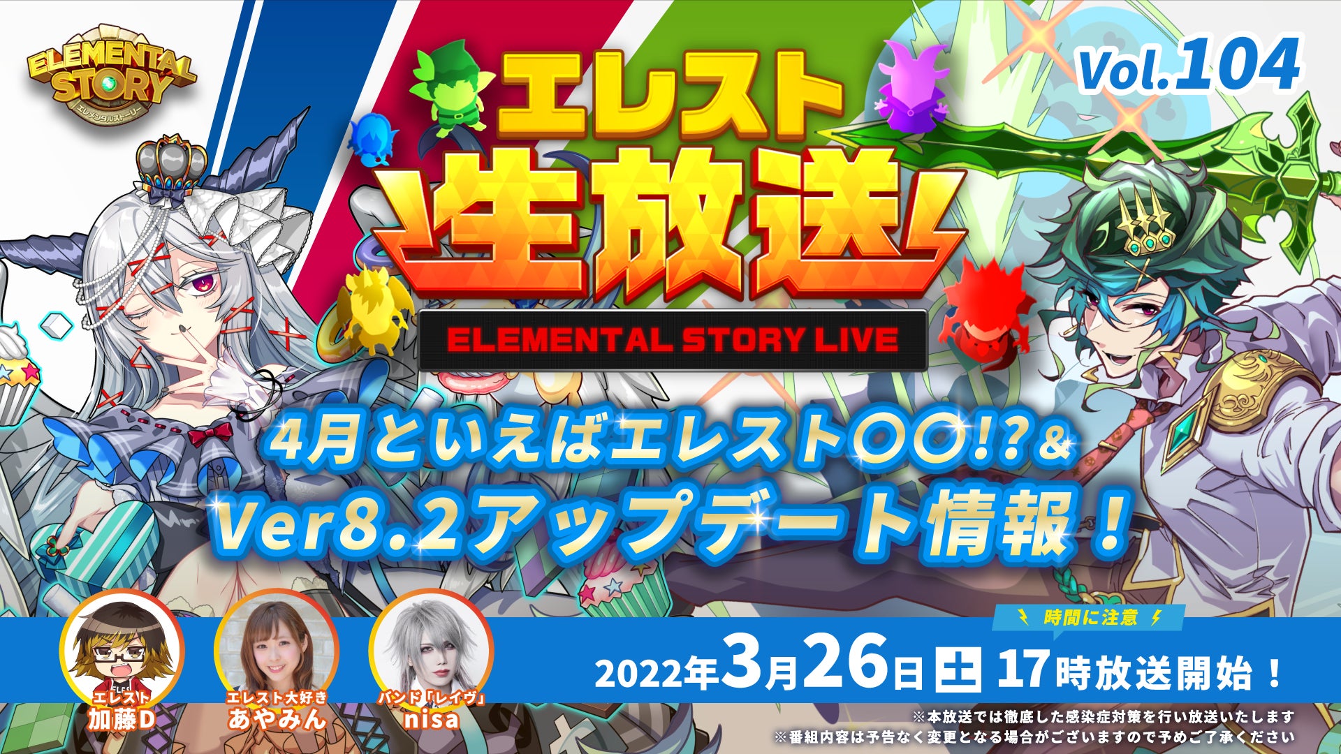 StudioZ株式会社(本社:東京都港区 代表取締役CEO:池幡 賢)が運営しております 共闘対戦 爽快パズル消しゲー『エレメンタルストーリー』は、2022年3月26日(土)17:00より、StudioZ公式エレスト生放送vol.104を配信いたします。4月の新イベントおよび新モンスター情報や、放送記念プレゼント、生放送限定グランバトルを実施予定となります。