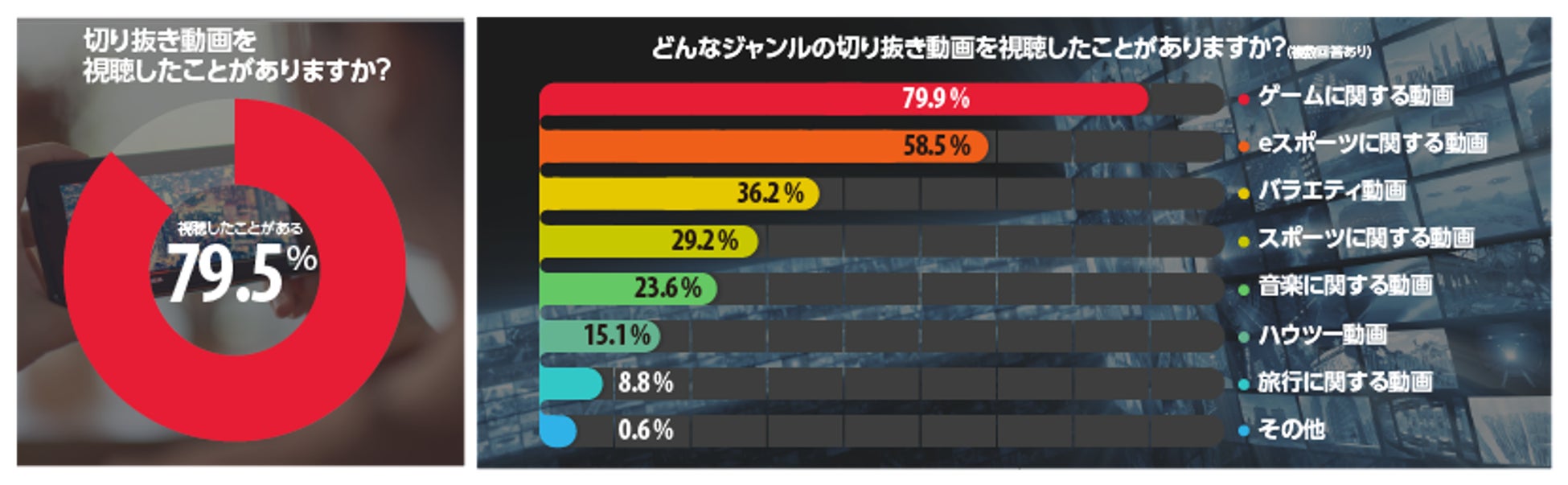 切り抜き動画(オリジナルの配信動画から任意のシーンを切り抜き、編集し繋ぎ合わせた動画)を視聴したことがあるかという問いに対して、eスポーツ観戦者の79.5%が、視聴したことがあると回答。さらに、切り抜き動画の中で視聴したことがあるものについて、「ゲームに関する動画(79.9%)」、「eスポーツに関する動画(58.5%)」と、eスポーツにおいて切り抜き動画の理解が広がっていることが判明しました。