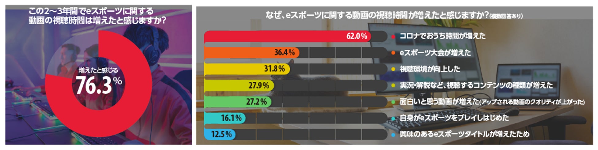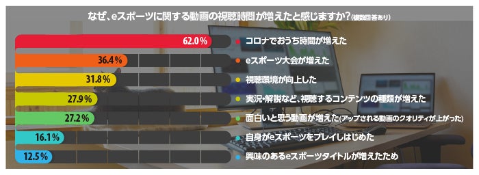 eスポーツに関する動画の視聴時間の増加理由について、「コロナでおうち時間が増えたため」が62.0%と最も多く、他にも「視聴環境が向上したため」が31.8%と環境の変化に起因して視聴時間が伸びたと回答した人が多い結果となりました。また、「eスポーツ大会が増えたため」が36.4%、「実況・解説など、視聴するコンテンツの種類が増えたため」が27.9%、「面白いと思う動画が増えたため(アップされる動画のクオリティが上がった)」が27.2%と、eスポーツに関するコンテンツの数や質が向上していることも、視聴時間を延ばす大きな要因となっていることが判明しました。
