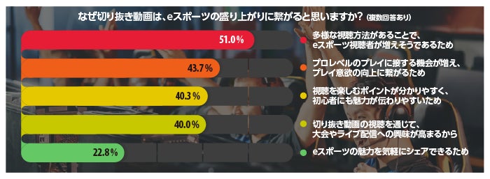 また、「プロレベルのプレイに接する機会が増え、プレイ意欲の向上に繋がるため」が43.7%となりました。高いレベルのプレイを気軽に視聴できる切り抜き動画は、eスポーツプレイヤーの意欲を向上させると考えられているようです。