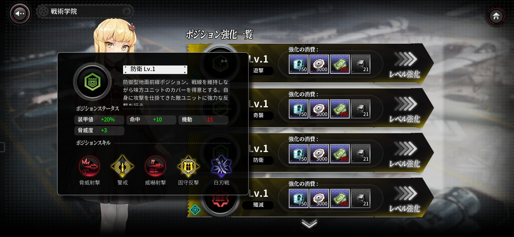 「戦術アカデミック」は、改造素材を使ってDOLLSのポジションスキルを強化する機能です。