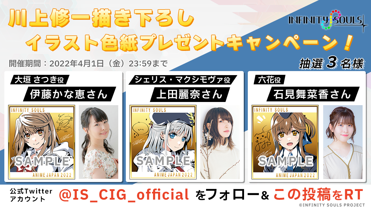 2022年3月27日(日)開催した「スマートフォン向けゲーム「INFINITY SOULS」C.I.G 広報室 in AnimeJapan2022」に出演した伊藤かな恵、石見舞菜香、上田麗奈が演じるキャラクターをアートディレクター川上修一が描き下ろし、それぞれのキャストがサインを入れた特製イラスト色紙を抽選で3名様にプレゼントいたします。