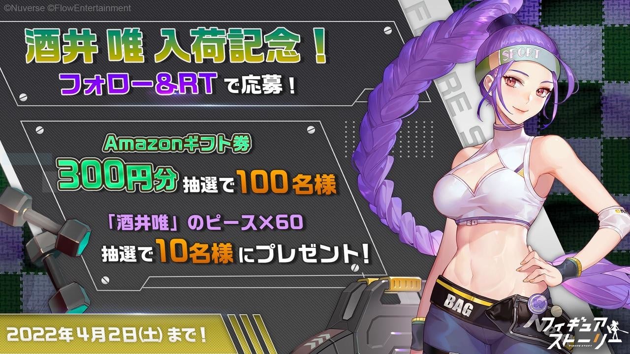 Nuverse株式会社は、運営するスマートフォン向け“フィギュアRPG”『フィギュアストーリー(以下ギアスト)』において、3月27日(日)に新フィギュア(キャラクター)の「酒井唯(CV:市ノ瀬加那)」やスキン(着せ替え)、および関連するシナリオイベントを実装いたしました。また、新フィギュアの実装を記念して、Amazonギフト券が抽選で100名に当たるキャンペーンをTwitter上で行います。