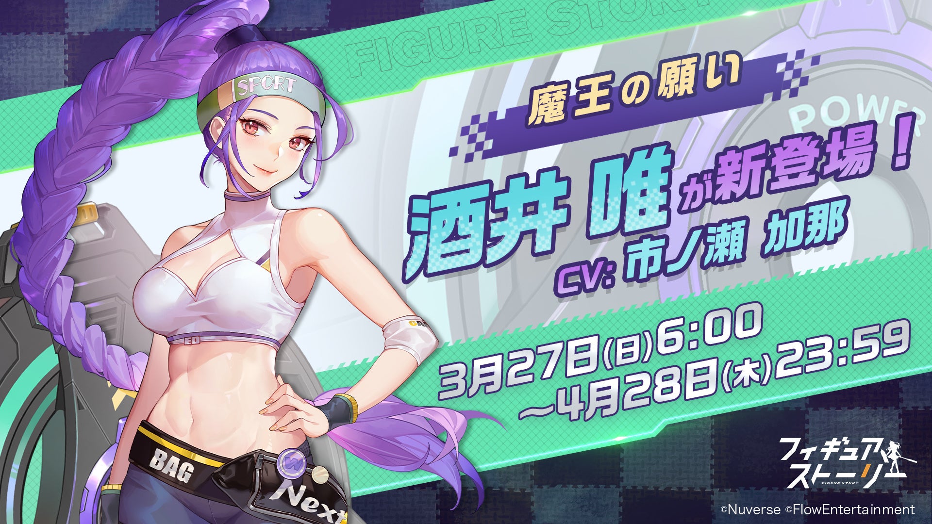 Nuverse株式会社は、運営するスマートフォン向け“フィギュアRPG”『フィギュアストーリー(以下ギアスト)』において、3月27日(日)に新フィギュア(キャラクター)の「酒井唯(CV:市ノ瀬加那)」やスキン(着せ替え)、および関連するシナリオイベントを実装いたしました。また、新フィギュアの実装を記念して、Amazonギフト券が抽選で100名に当たるキャンペーンをTwitter上で行います。
