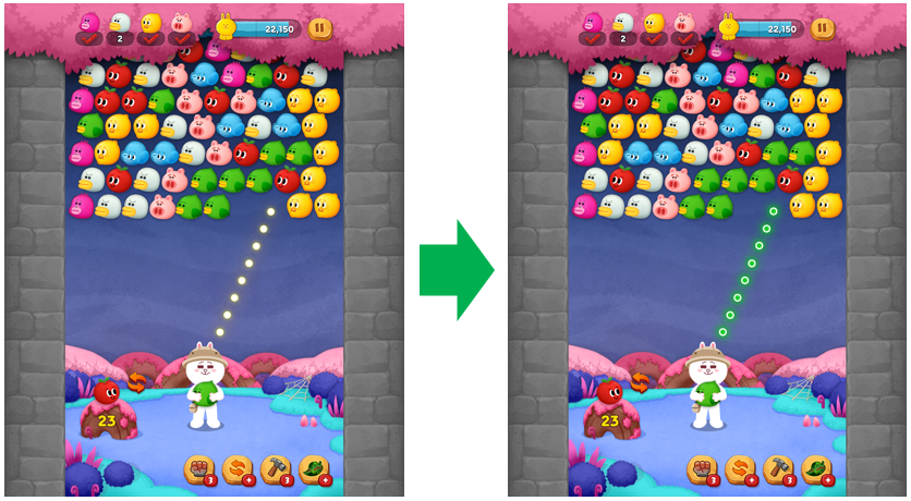コニーの投げるバブルの軌道を表示してくれる「ガイド」機能をアップデートしました。ガイドの色が投げるバブルと同じ色になり、シューティングミスが減り快適に遊べるようになりました。