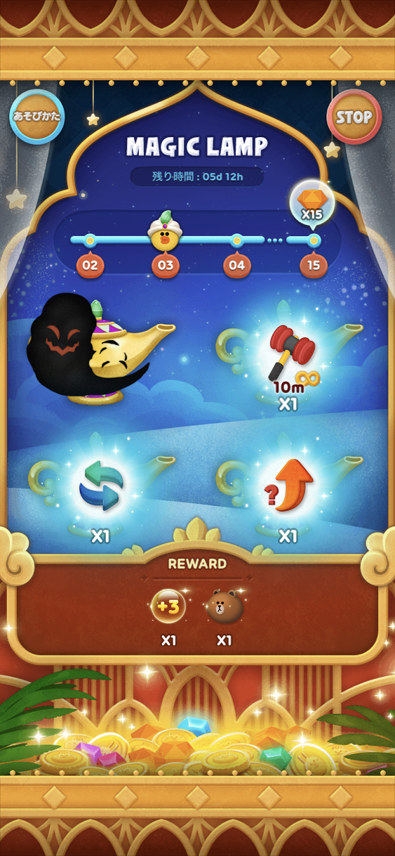 指定のステージをクリアすると魔法のランプの運試しに挑戦できます。4つのランプのうち、3つにアイテム、1つに“魔神”が潜んでいます。魔神が潜んでいるランプを避けて、アイテムをたくさん獲得しましょう。