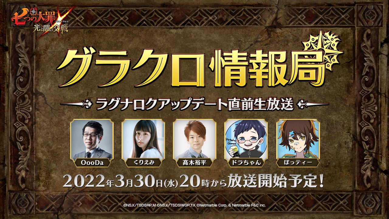 ◆グラクロの最新情報をお届けする公式番組「第32回グラクロ情報局 ~ラグナロクアップデート直前生放送~」―3/30(水)20:00より生放送!