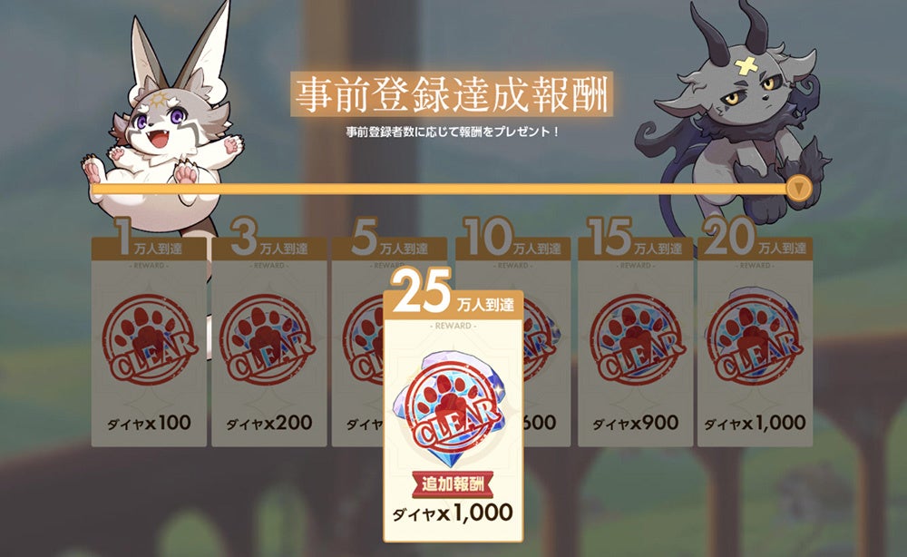 事前登録者数が25万人を突破いたしましたので、ゲーム開始時のプレゼントとして「ダイヤ ×4200個」が確定いたしました。プレゼントボックスより受け取りをお忘れなく!