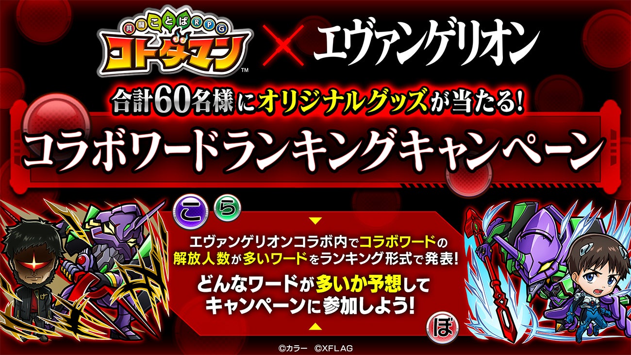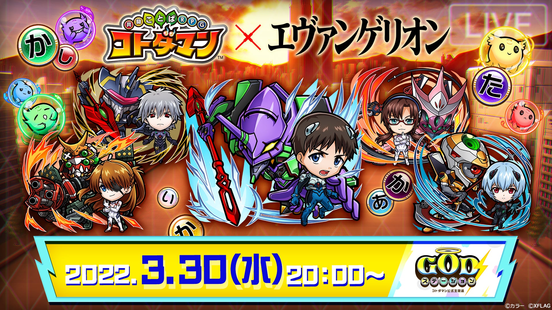 株式会社ミクシィ(東京都渋谷区、代表取締役社長:木村 弘毅)が展開するエンターテインメント事業ブランド「XFLAG (エックスフラッグ)」は、スマホアプリの「ことば」で闘う新感覚RPG「共闘ことばRPG コトダマン」(以下、コトダマン)において、「エヴァンゲリオン」とのコラボ第2弾を2022年3月31日(木)より開催します。