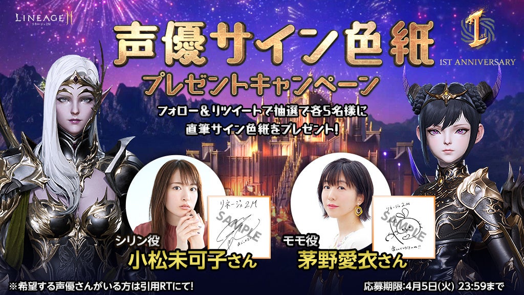 1周年を迎えた『リネージュ2M』から感謝を込めて、出演声優さんの直筆サイン色紙を抽選でプレゼントします。