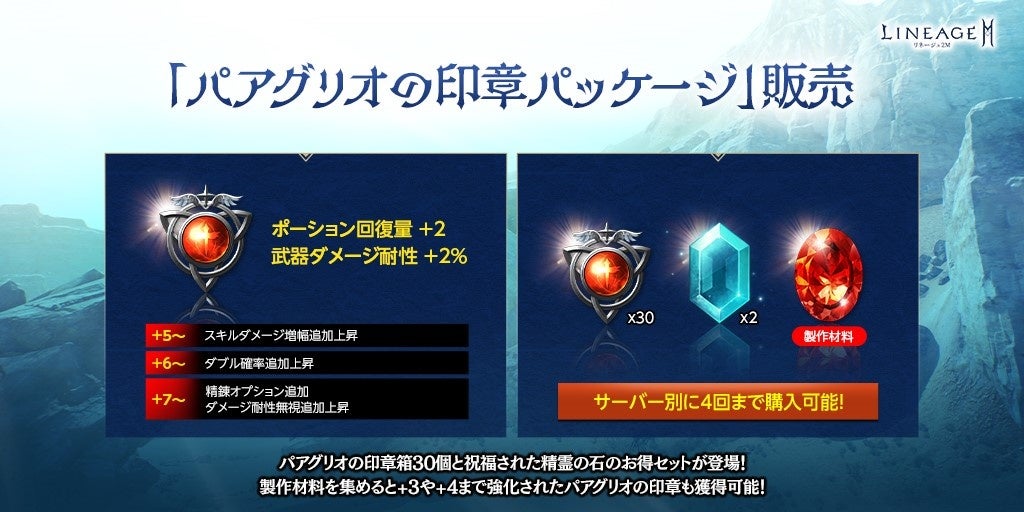 クラスまたはアガシオンの召喚55回分に「成長の砂時計箱(刻印)」30個、「勇猛の証(刻印)」1個などがセットになった「勇猛の証パッケージII」と、「勇猛の証パッケージIII」が登場しました。