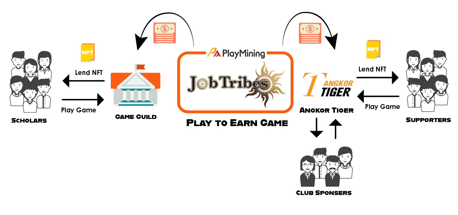 アンコールタイガーFCはDEA社が運営するゲームプラットフォーム「PlayMining」上のデジタル資産・ゲームアイテムのNFTをクラブスポンサーの投資資金を活用して購入し、ゲーミングギルドとしてDEA社のPlay to Earnゲームに参画する計画です。