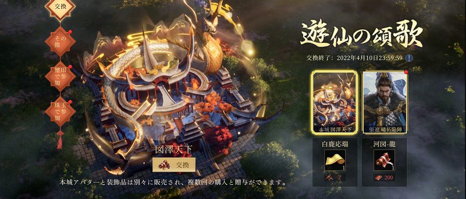 内容:イベント期間中に、璽印或は珠玉を使って祈願を行えます。祈願でイベントアイテムを集め、新しい本城アバターもしくは名将張遼の3Dアバターなどの豪華報酬と交換できます。