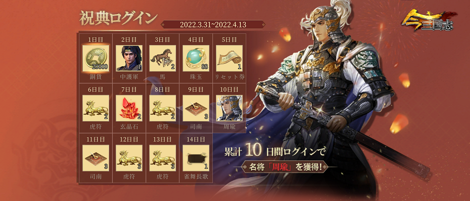 内容:14日間連続ログインすると、名将周瑜や会話バブル、武将募集アイテムなどの豪華アイテムを獲得できます。