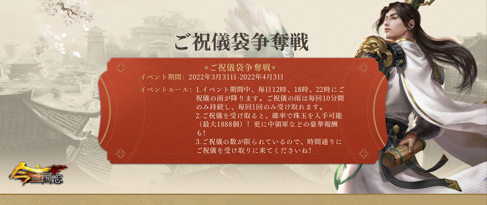 内容:イベント期間中に、毎日の12時、18時、22時にご祝儀袋が出現します。ご祝儀を受け取ると、確率で最大1888個の珠玉を入手可能!更に中領軍などの豪華報酬も!