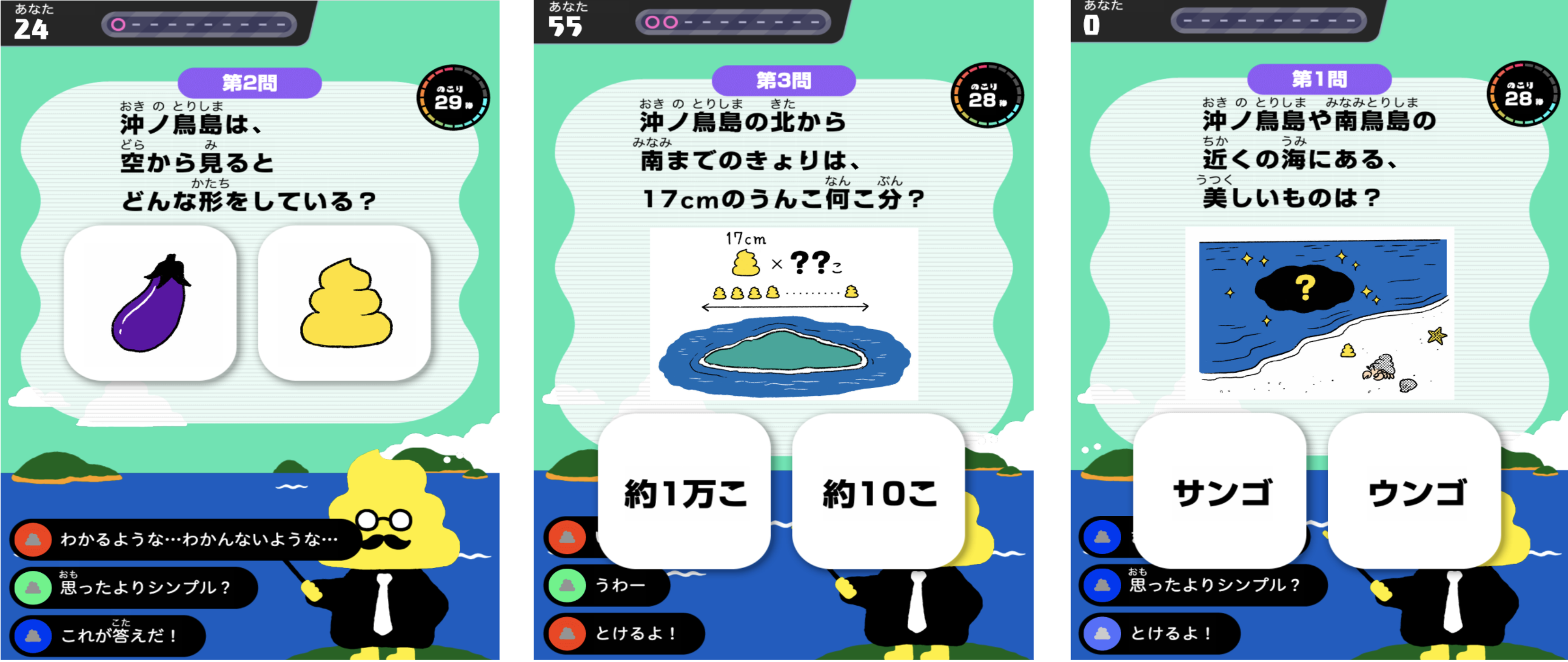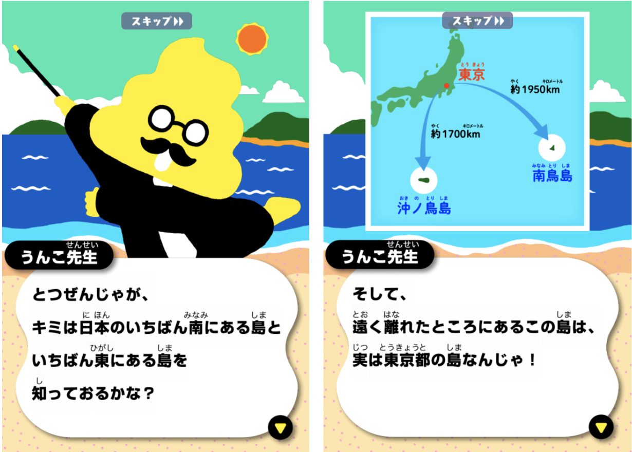 クイズゲーム感覚で、沖ノ鳥島・南鳥島について楽しく学ぶことができます。「うんこドリル」のキャラクターである「うんこ先生」が、全20問の中から毎回10問をランダムに出題します。クイズは、沖ノ鳥島・南鳥島に関する基礎的な知識からの出題で、出題形式は2択問題、マルバツなど様々です。