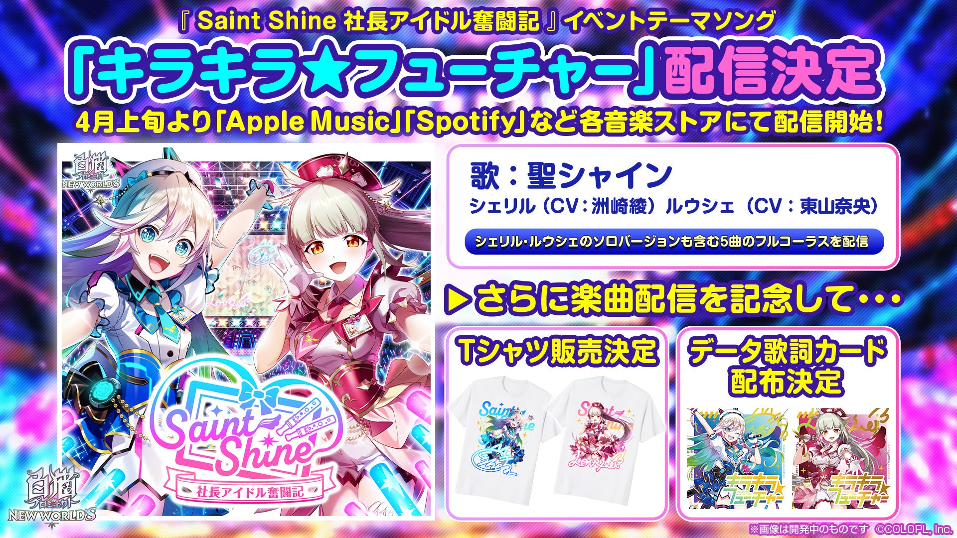 この「キラキラ☆フューチャー」は後日各楽曲配信サイトでの販売を予定しており、販売に合わせて「Saint Shine ~社長アイドル奮闘記~」特設サイトでは歌詞カードの配布やルウシェとシェリルのイラストを使用したTシャツの販売を予定しております。