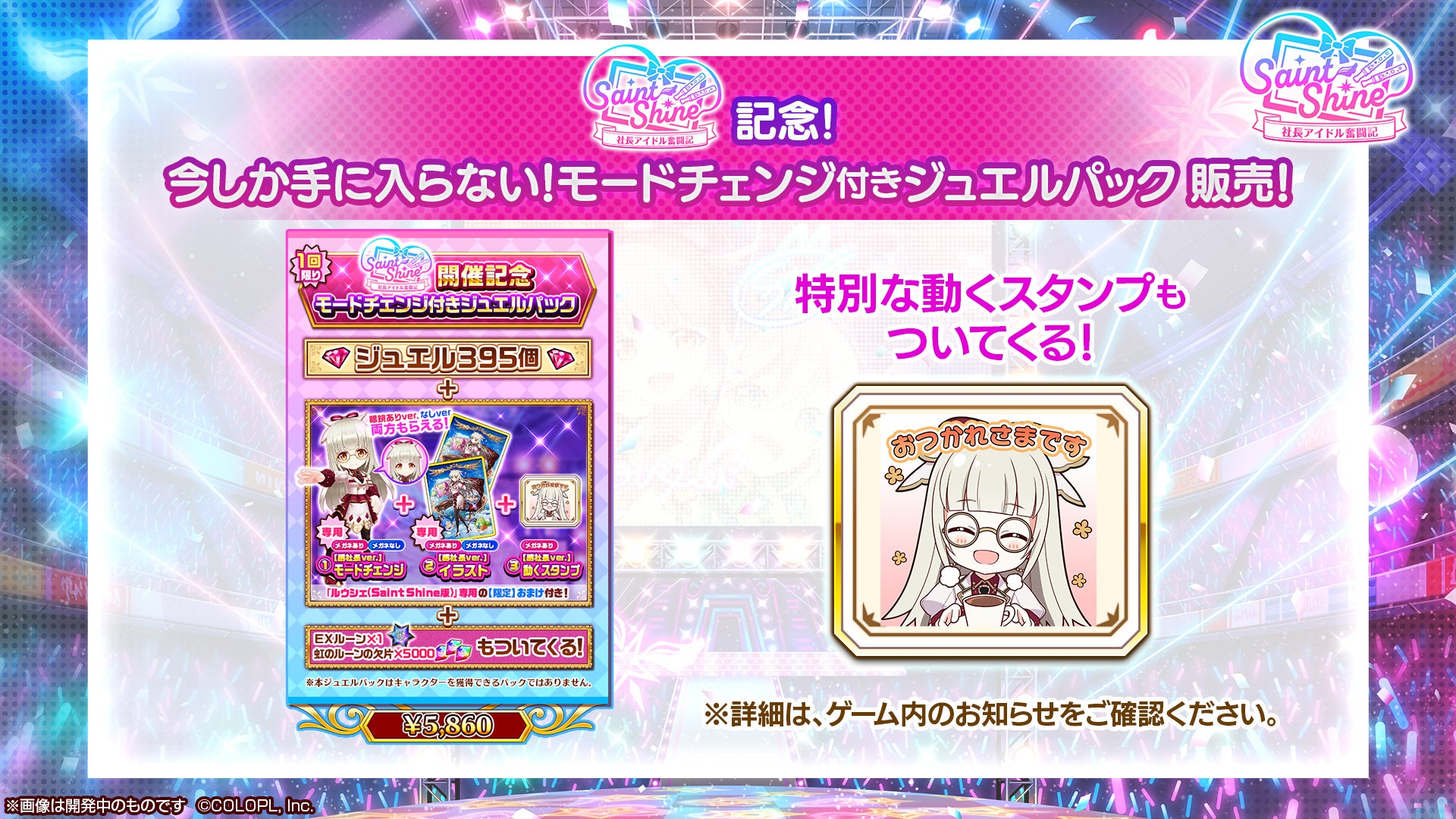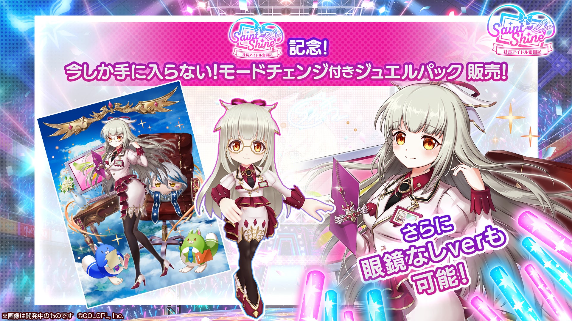 今回のジュエルパックには、『新イベントキャラ保証』がついた「プレミアムジュエルパック」に加えて、「Saint Shine ~社長アイドル奮闘記~」キャラガチャに登場するルウシェの副社長バージョンのモードチェンジがついた「モードチェンジ付きジュエルパック」が販売ラインナップに追加されております。