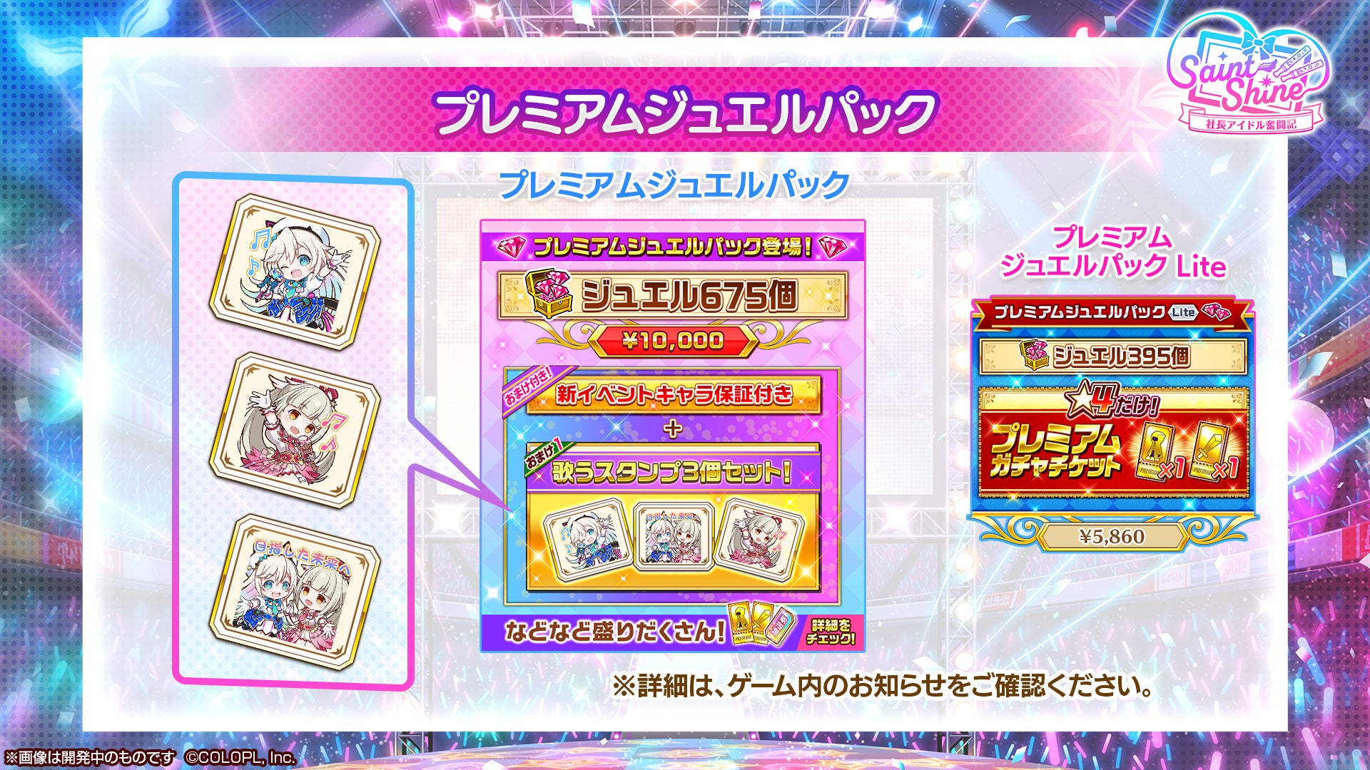 「プレミアムジュエルパック」には、ゲーム内楽曲「キラキラ☆フューチャー」の歌うスタンプが3種ついてきます。