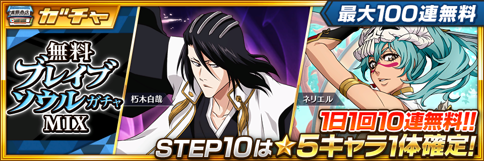 1日1回10連無料、期間中最大100連無料のガチャが登場!STEP10で★5キャラクターが1体確定で出現!