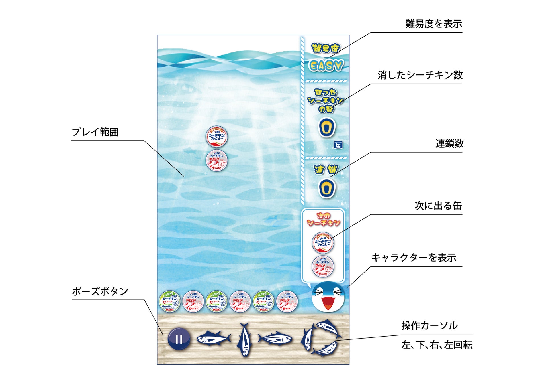 ひとことで「シーチキン」といっても、魚の種類や魚肉の形状、調理の方法(油漬・水煮・食塩不使用等)により、たくさんの種類があり、このゲームを通して、「シーチキン」について楽しく学ぶことができる仕様になっています。