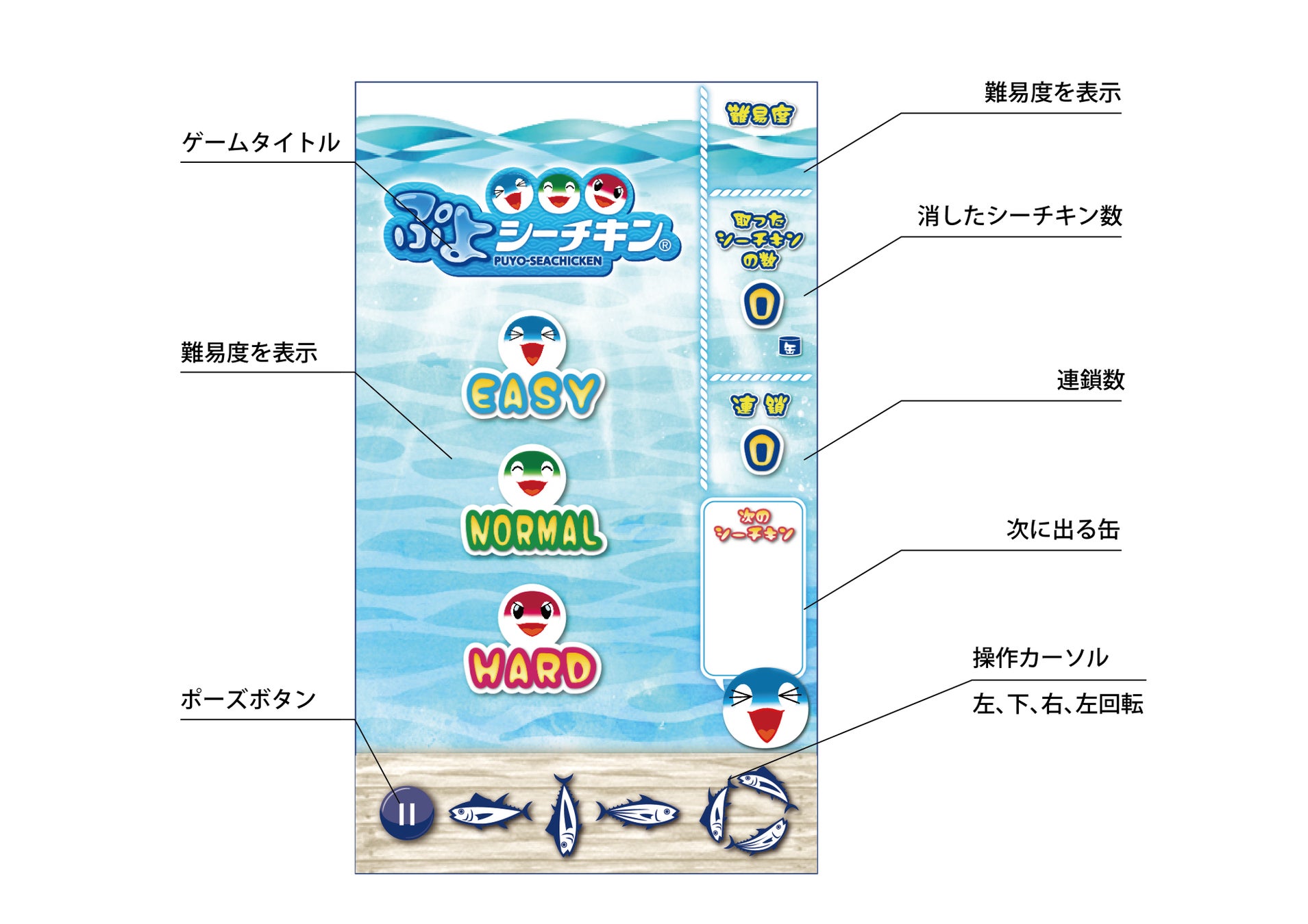 本作は「ぷよぷよ」の基本ルールをそのままに、上から落ちてくる「シーチキン」を連結させて消していく落ち物パズルゲームです。「Easy」「Normal」「Hard」と、ゲームの難易度を上げると登場するシーチキンの種類が増えていきます。落ちてくるシーチキンは難易度によって4~9種類あり、難易度が高くなると瞬時に見分けるのは難しいです。是非最高レベルを目指してチャレンジしてみてください。
