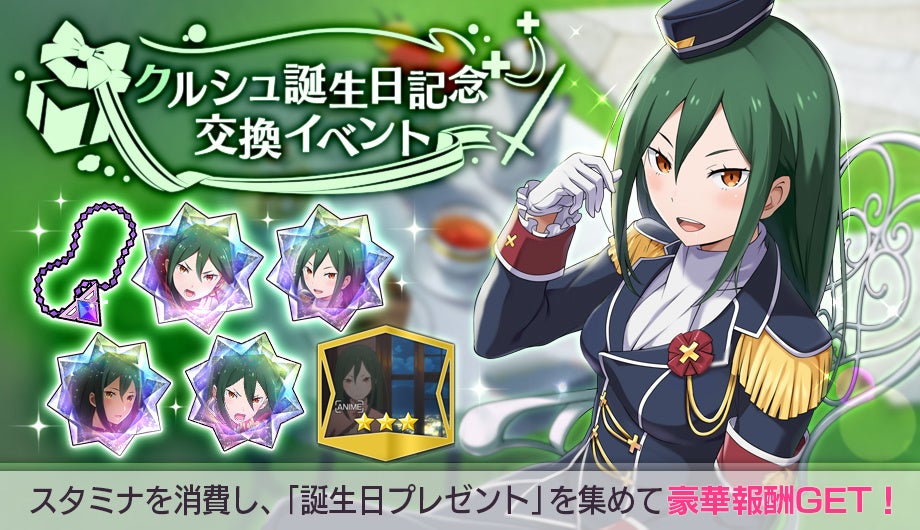 内容:期間中に追憶郷クエスト、育成ダンジョン、記憶の深淵をプレイすると手に入る「誕生日プレゼント(クルシュ)」の獲得数に応じて豪華報酬がもらえる「クルシュ誕生日記念 交換イベント」を開催します。