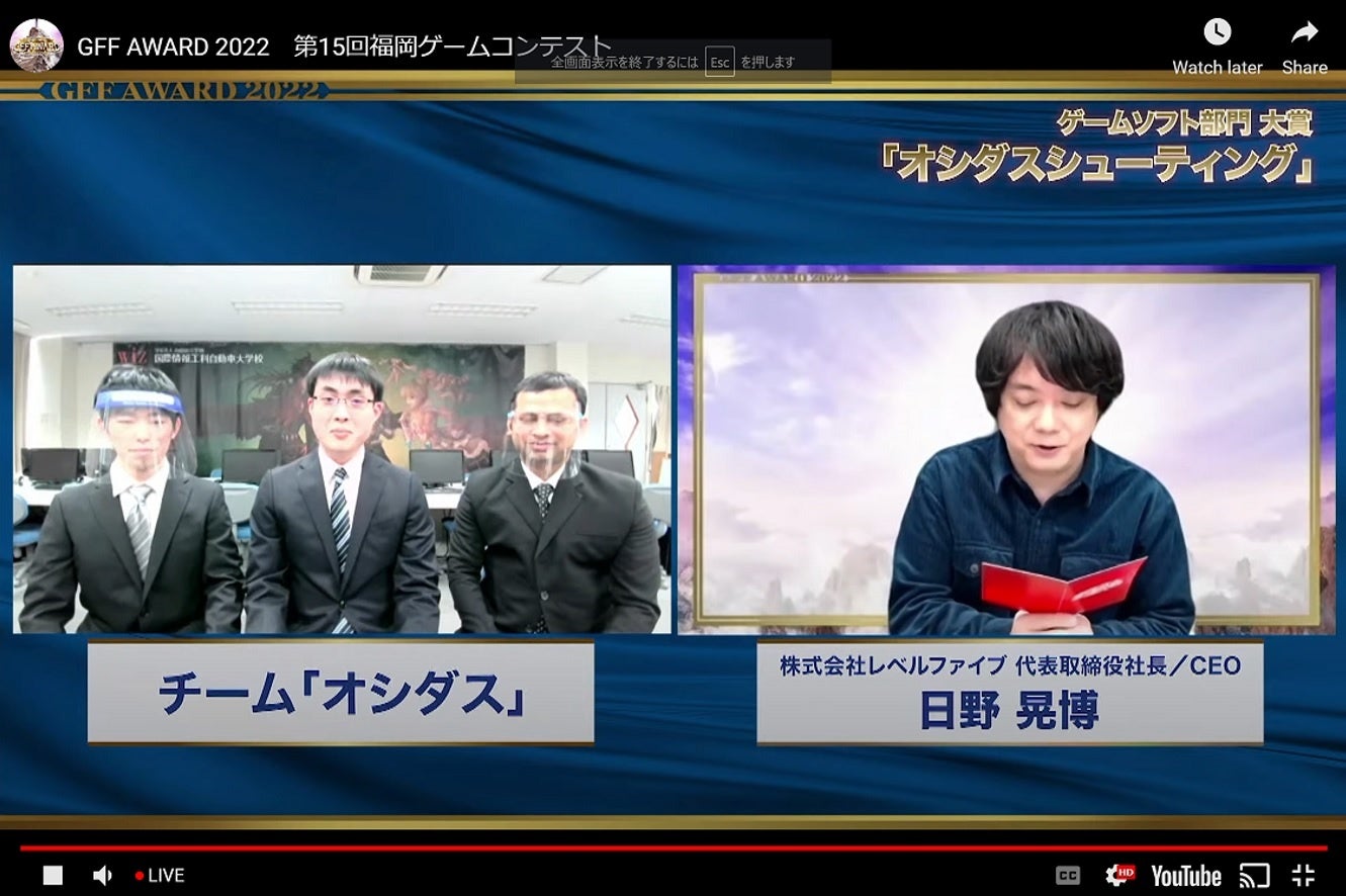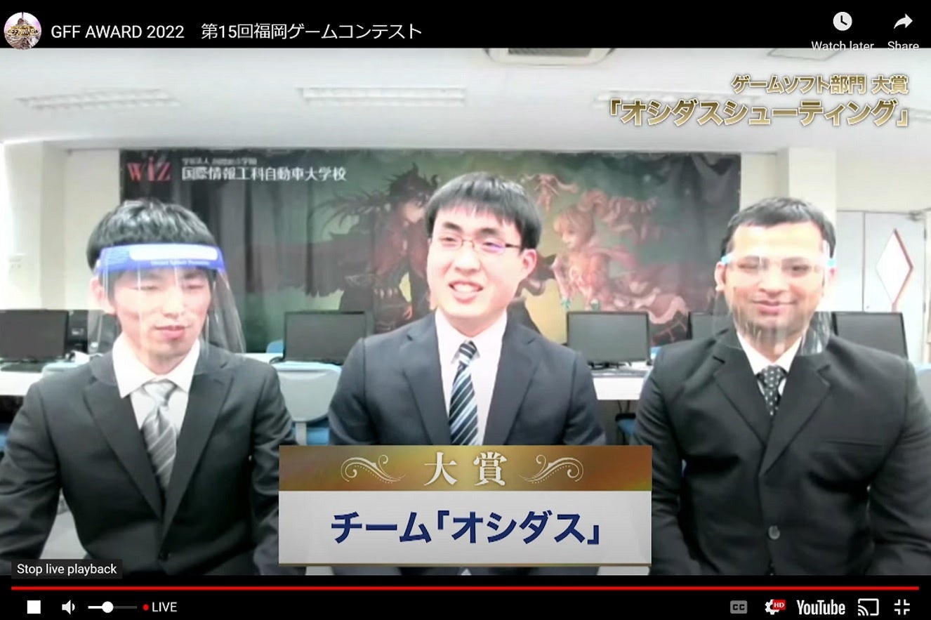 NSGグループで福島県郡山市にあるFSGカレッジリーグ国際情報工科自動車大学校(以下WiZ)は、2022年3月26日(土)に福岡ゲームコンテスト「GFF AWARD2022」がオンラインで開催され、ゲームソフト部門にて本校学生が制作したゲームアプリ『オシダス シューティング』が大賞を受賞し、日本一となりました。