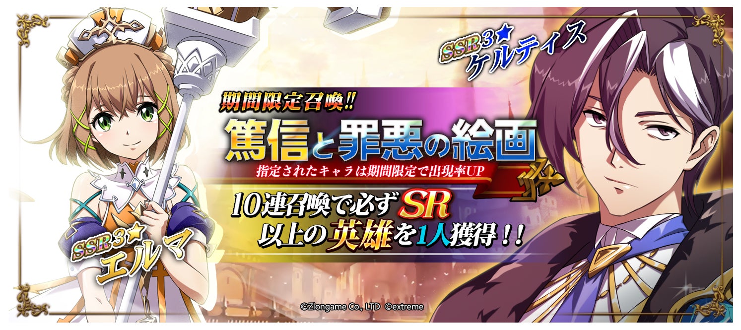 『篤信と罪悪の絵画』は10連召喚で必ずSR以上の英雄を一人獲得できる、期間限定召喚です。SSRケルティス、SSRエルマの出現確率が期間限定でアップします。