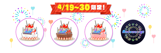 1周年を記念して、3種類の「アニバーサリーケーキ」」と「Anniversary!!花火」が期間限定で登場します。大変かわいらしいエールになっておりますので、このエールを活用して1周年#ライブをお楽しみください。