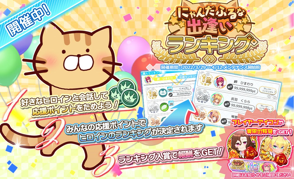 3月29日~4月12日の期間にて、本作のマスコットである「にゃんにゃんねこ」をフィーチャーした「にゃんだふるな出逢いランキング」を開催中です!ヒロインと会話をするとお相手の女の子に応援ポイントがたまっていきます。蓄積された応援ポイントの総計によりヒロイン別人気ランキングが決定!さらにヒロイン別に応援ポイントを多く投じていただいた方には限定報酬獲得のチャンス!ぜひ奮ってご参加ください!